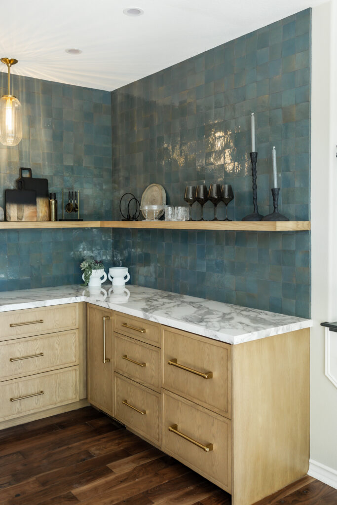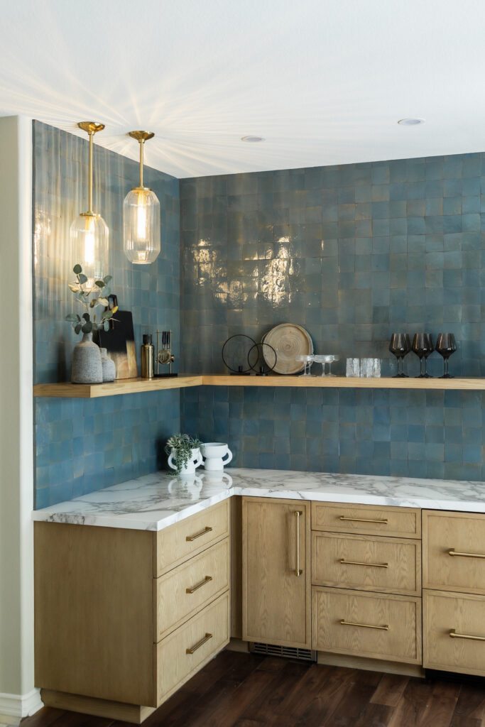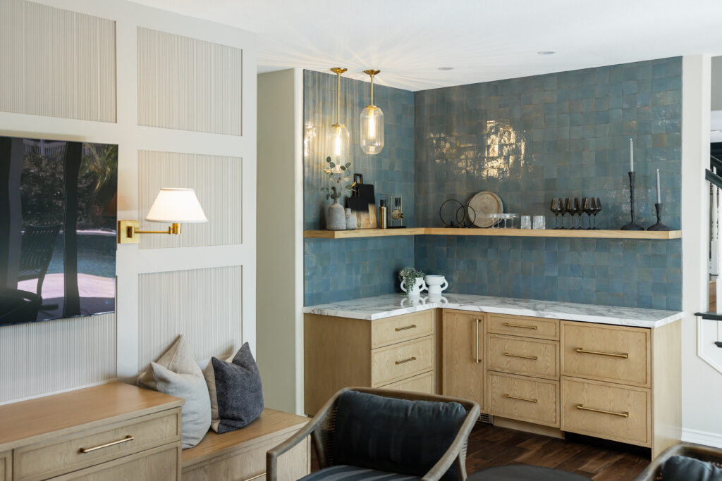 In our Shady Glen project, we transformed an underutilized area of the home into a layered bar and lounge space designed for both everyday living and effortless entertaining. The goal was to create a cohesive moment; one that feels architectural, warm, and seamlessly integrated into the surrounding living areas.
