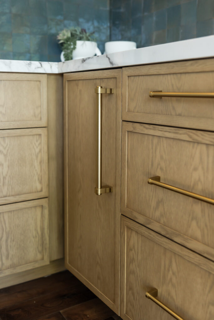 Anchoring the space is a custom built-in bar in white oak cabinetry, bringing warmth and natural texture to the design. Porcelain countertops were selected for their durability and subtle veining, offering a refined contrast to the wood tones while maintaining a clean, modern aesthetic. Panel ready refrigerator drawers and a built-in pebble ice maker are seamlessly integrated into the millwork, preserving the furniture like quality of the cabinetry while elevating functionality.