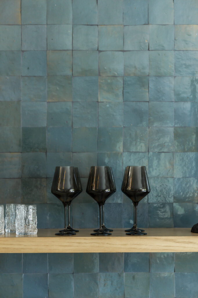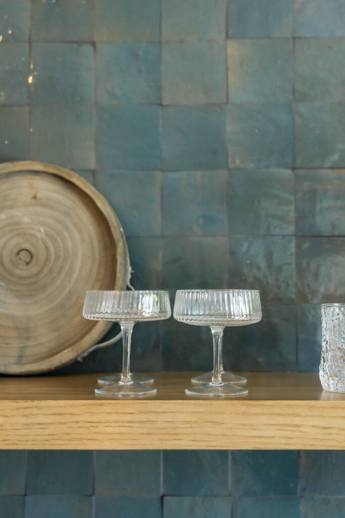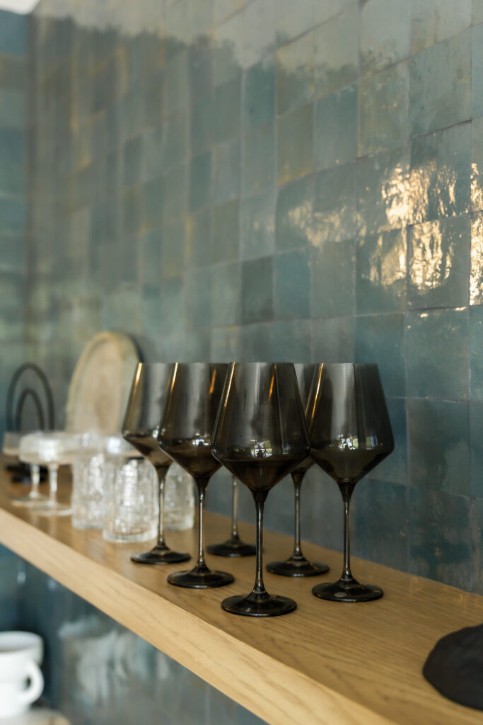 Floating white oak shelving above the bar offers an opportunity for curated styling; glassware, ceramics, and sculptural objects adding personality and warmth. Together, the layered materials, thoughtful lighting, and bespoke millwork create a space that feels elevated yet approachable, designed to evolve with how the homeowners live and gather.