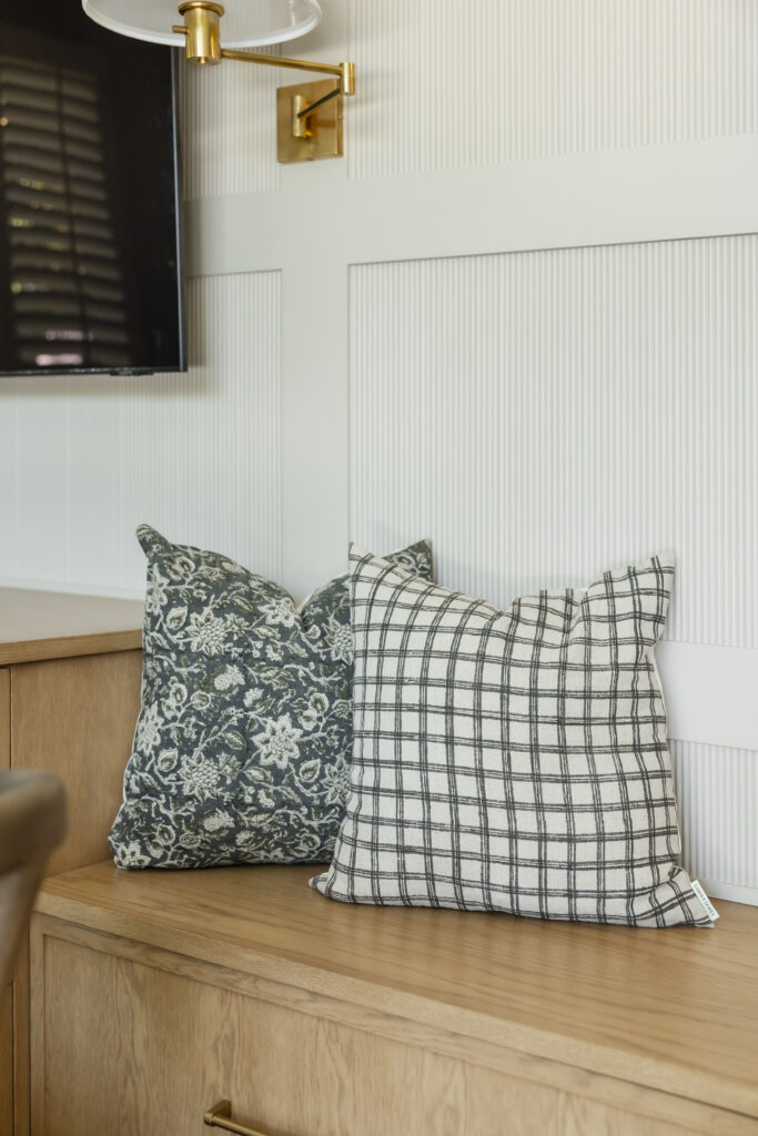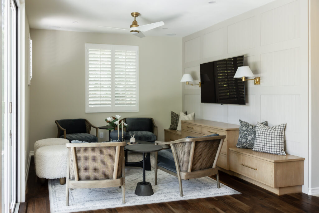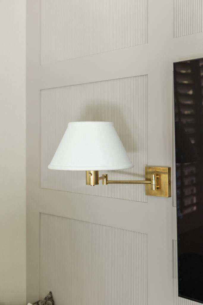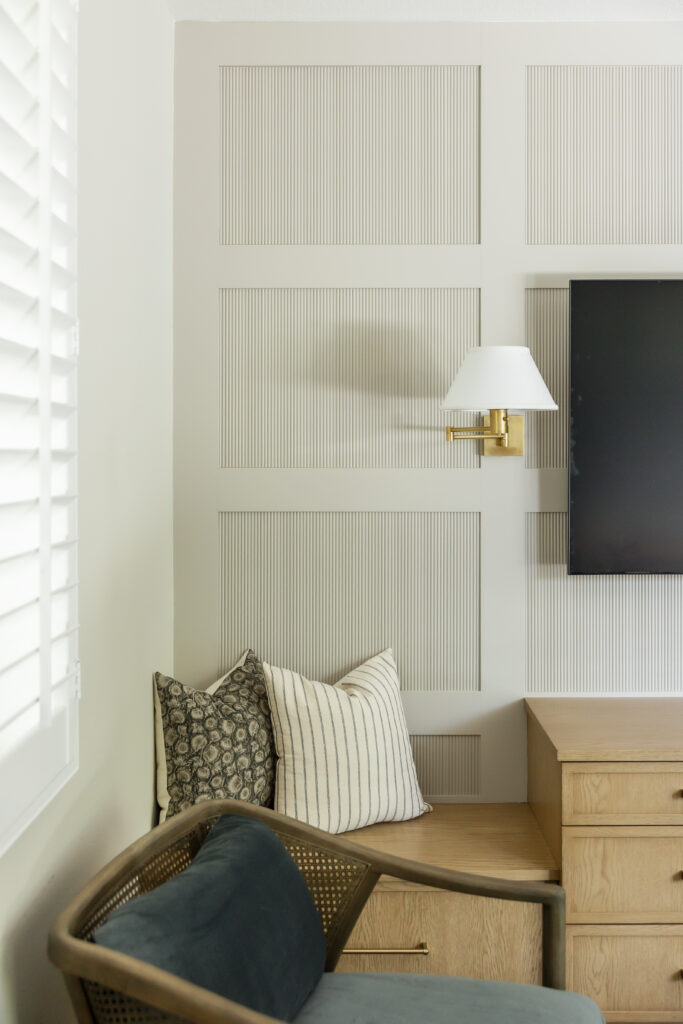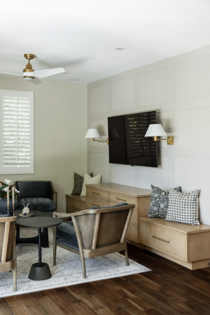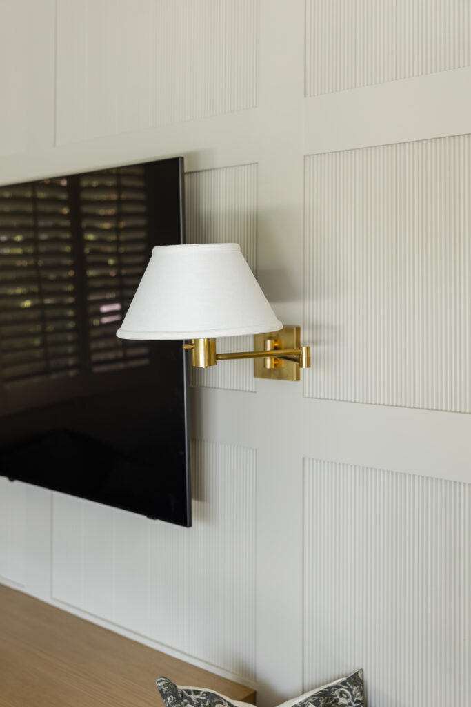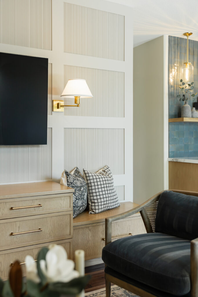 Behind the television, custom wall paneling introduces depth and rhythm through a reeded detail, adding a quiet layer of texture that feels both contemporary and timeless. Flanking the TV, sculptural wall sconces provide soft, ambient lighting and a sense of symmetry, framing the media wall with understated elegance. Below, a custom built in with integrated bench seating extends the millwork across the wall, blurring the line between cabinetry and furniture while inviting casual lounging and conversation.