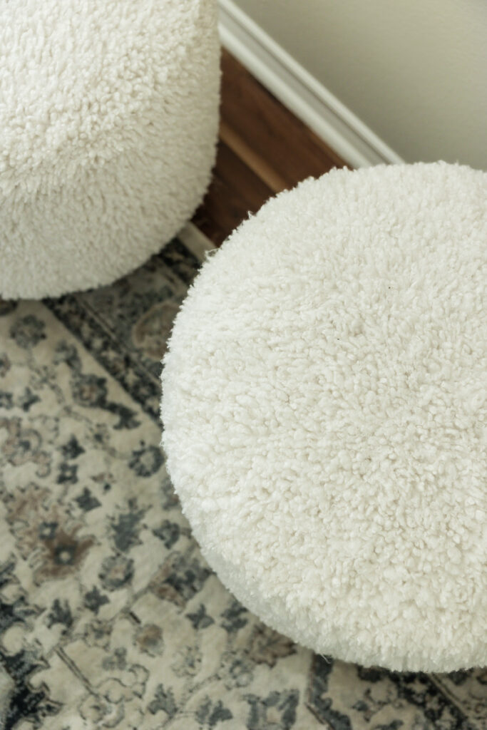 A custom area rug grounds the seating zone, softening the architecture and adding subtle pattern and texture underfoot. Accent tables in dark, matte finishes provide visual weight and functional surfaces without competing with the millwork, while layered pillows in tonal patterns bring depth and warmth to the benches.