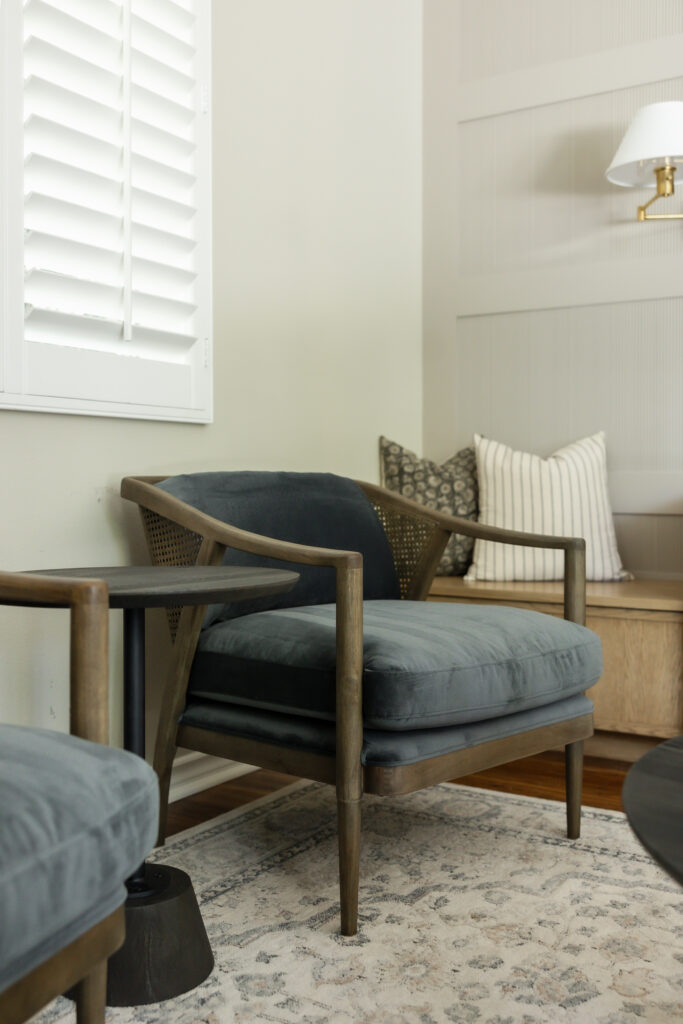 The furniture palette was carefully curated to balance structure with softness. Lounge chairs with sculptural wood frames and deep, moody upholstery introduce contrast against the lighter millwork, while woven cane detailing adds an organic layer that echoes the natural materials throughout the space. A mix of soft textiles and tailored silhouettes creates a relaxed yet elevated seating arrangement inviting conversation while maintaining a refined visual rhythm.
