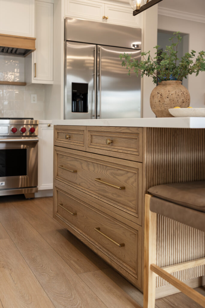 No element in a kitchen remodel carries more design weight than the island, and here it earns every square inch. Generous proportions accommodate casual dining, homework sessions, and prep work simultaneously the functional demands of a real family. The contrasting white oak wood grounds the island as a distinct object within the kitchen rather than a continuation of the perimeter, giving the space a layered, furniture-like quality that elevates the overall design.