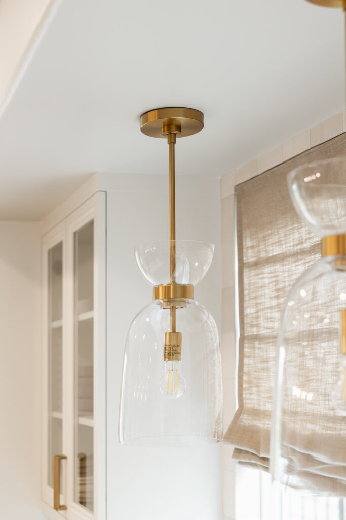 Pendant lighting above the island was selected for its sculptural quality as much as its illumination.